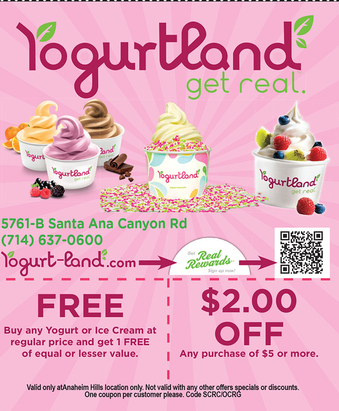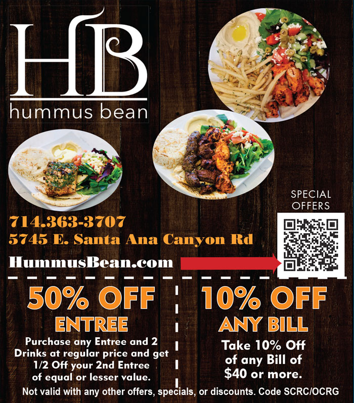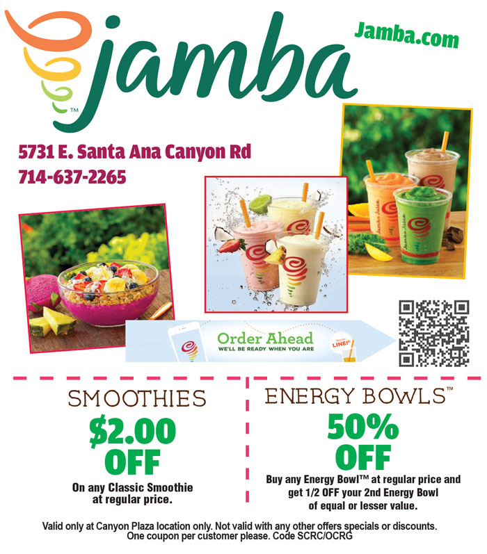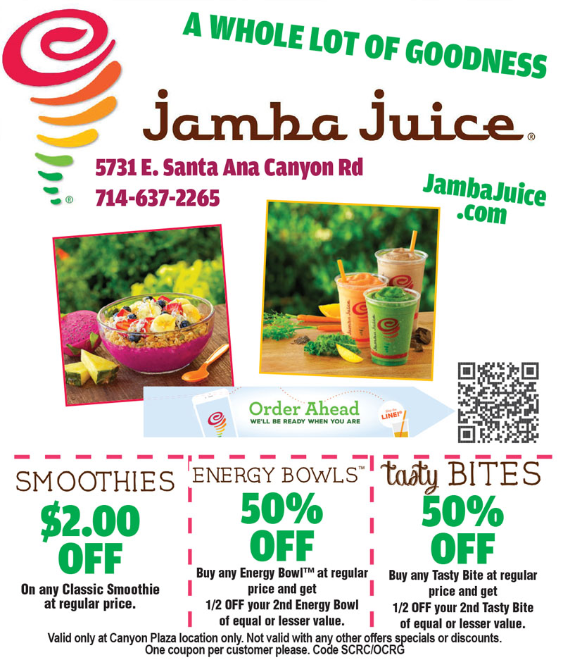 Canyon Plaza Jamba Juice 5731 E. Santa Ana Canyon Rd (714) 637-2265 Visit our Website Reunion Kitchen 5775 E. Santa Ana Canyon Rd (714) 283-1062 Visit our Website Hummus Bean 5745 E. Santa Ana Canyon Rd (714) 363-3707 Visit our Website Board & Brew 5721 E. Santa Ana Canyon Rd (714) 602-8853 Visit our Website Yogurtland 5761 E. Santa Ana Canyon Rd (714) 637-0600 Visit our Website