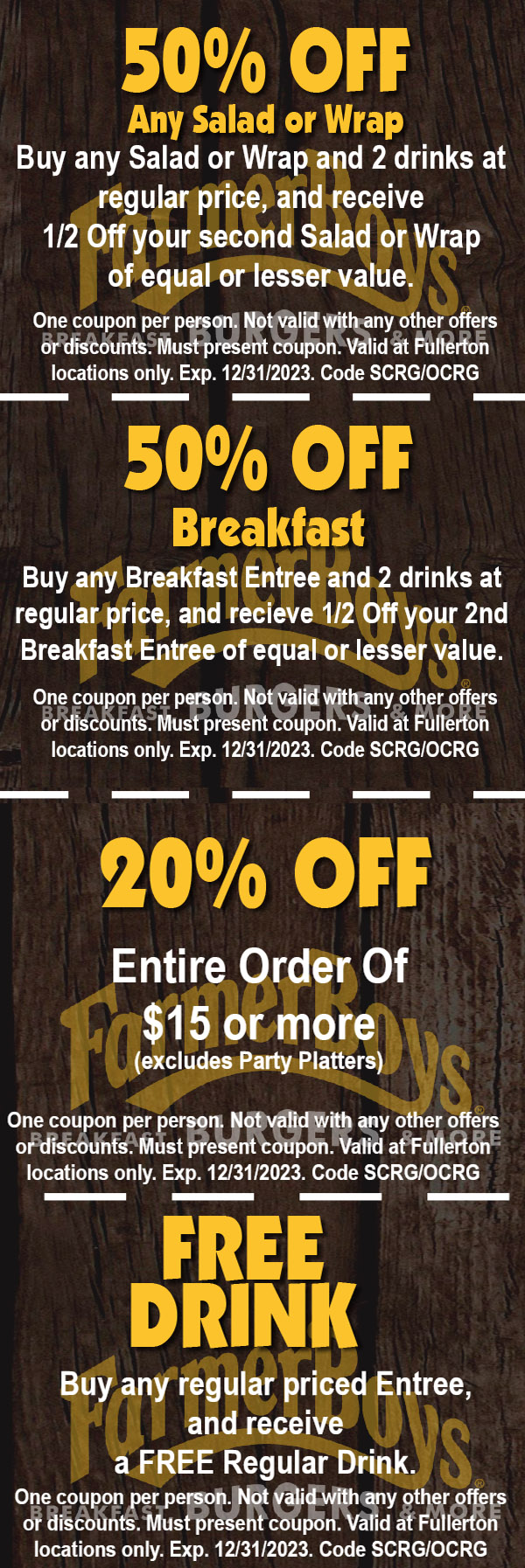 Farmer Boys – Harbor Fullerton Fullerton 1446 N. Harbor Blvd Call for Reservations/Ordering 714.578.5000 Visit our Website Just show your coupon to your server and $AVE!